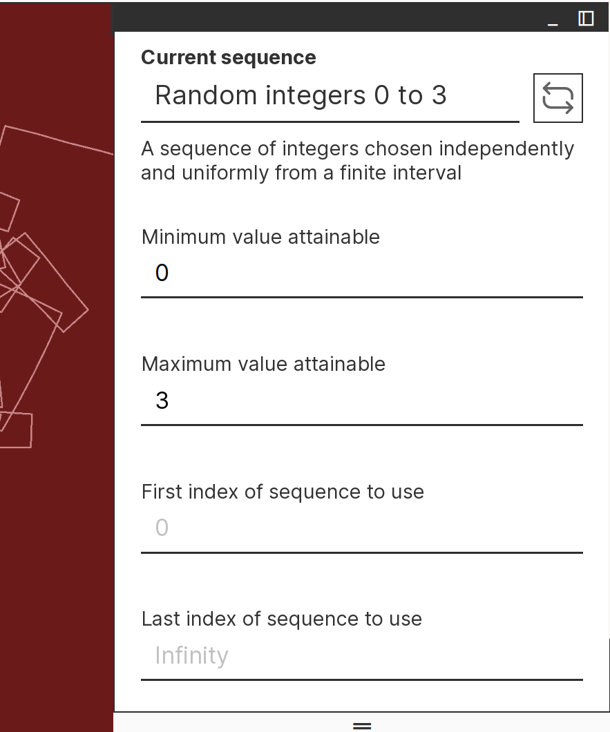 Note that the particular entries of an instance of this sequence remain fixed as you change the parameters of the visualizer, or use the "restart" button in the Numberscope title bar. They also remain fixed if you change the first index, last index, or number of terms to use.