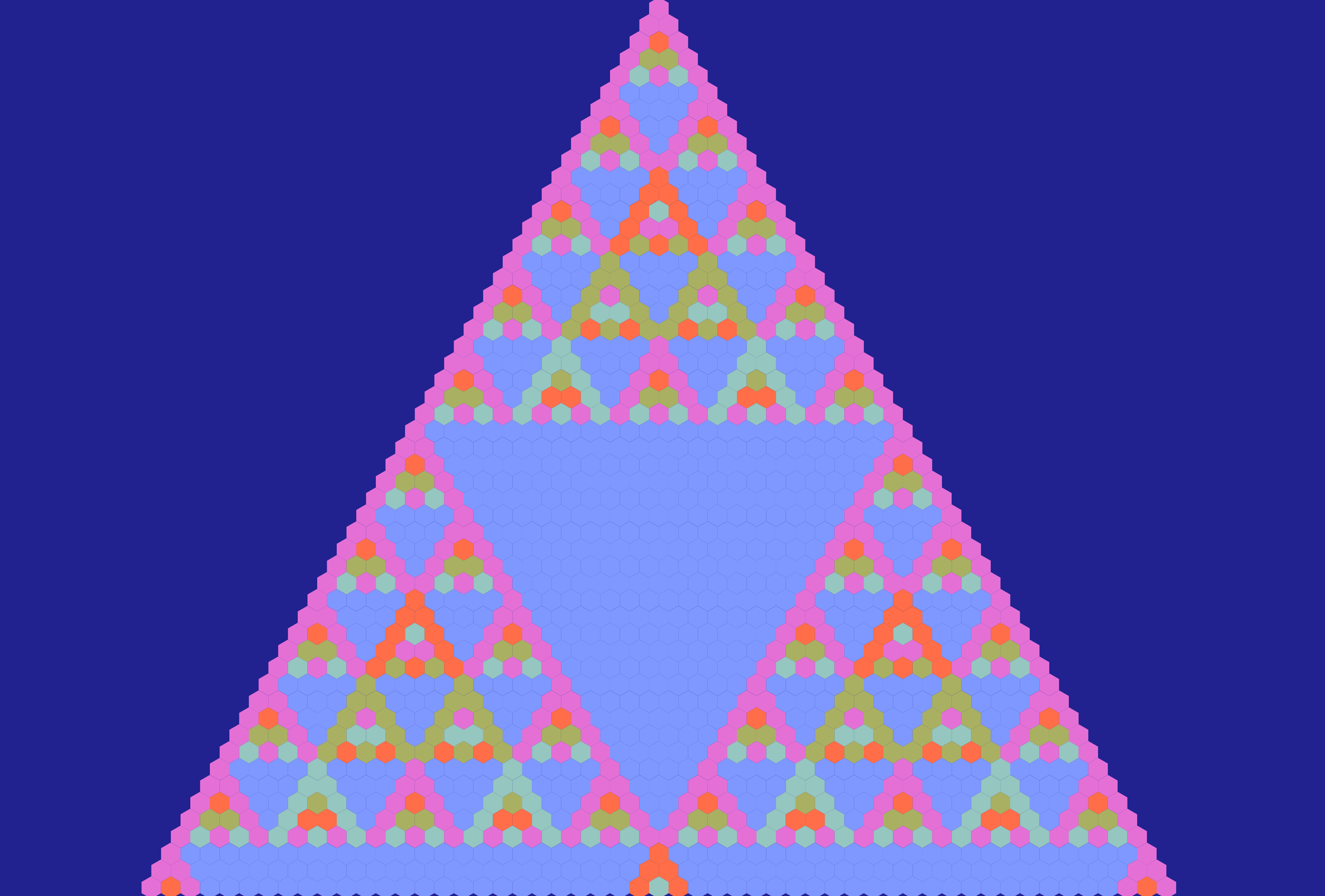 {rectangle: (k % 7) == 1, square: not(k % 11) and red} - Tile the plane with hexagons in a rainbow given by their distance from the