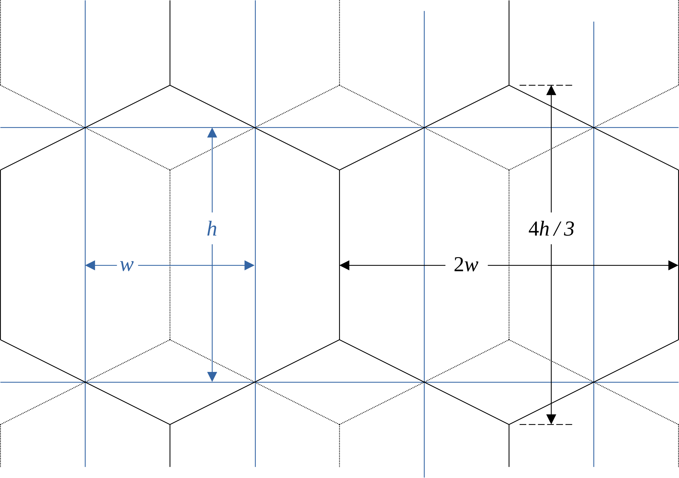 - Draws a hexagon twice the width and 4/3 the height of a cell, in which the current cell is inscribed. The resulting hexagons doubly cover the plane; if you take the odd cells horizontally in one row and the even cells in the next, those hexagons tile the plane. Note the Triangle pre-set fill order only visits such cells, making this shape ideal for use along with the Triangle fill order when you want to display the rows of a triangular array with one entry in the first row, two in the second, and so on. When the aspect ratio of a cell is 1/√3, the hexagons are regular. See the accompanying diagram for the layout of the hexagons; the underlying rectangular cells are blue, each inscribed in the corresponding hexagon shape, which are drawn in black with every other one having dotted perimeter.