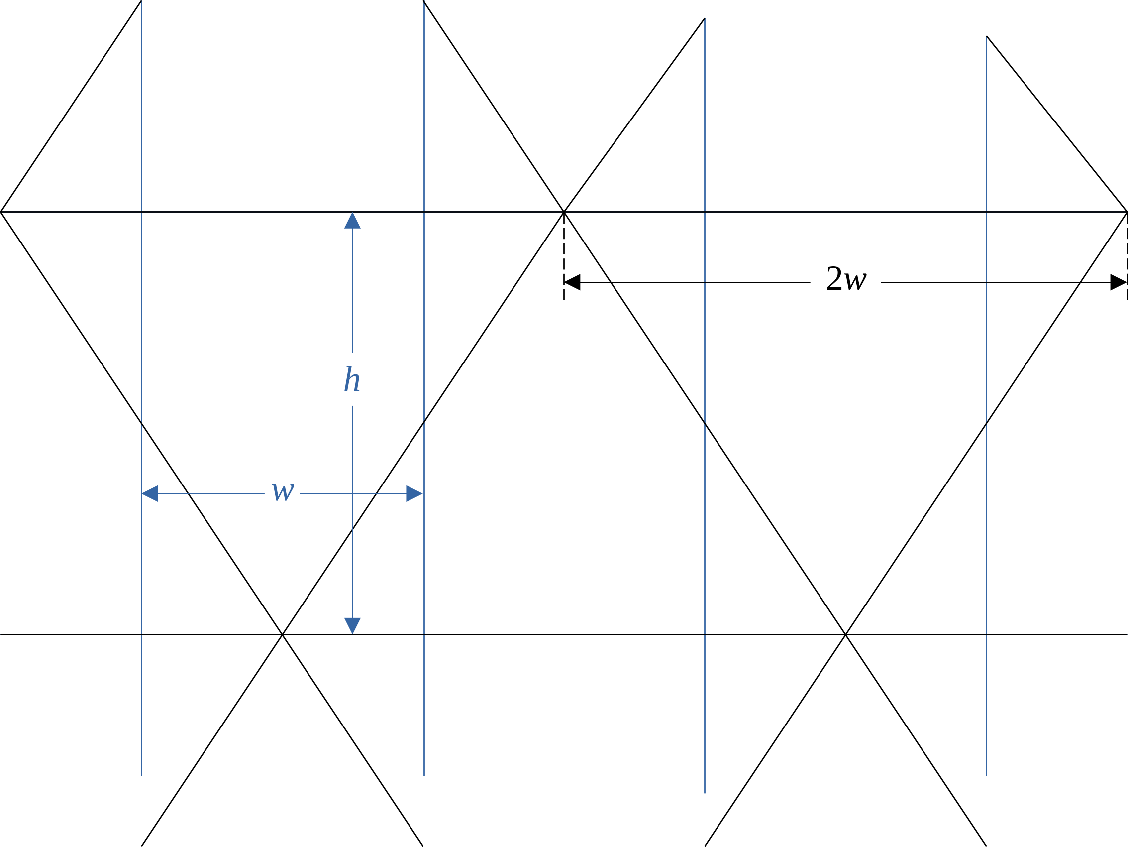 - Draws a triangle the height of a cell with horizontal base twice the width of a cell, centered on the current cell. On odd rows the odd triangles point up and the even triangles point down; on even rows the directions are reversed. The resulting triangles tile the plane. When the aspect ratio of a cell is 1/√3, the triangles are equilateral. See the accompanying diagram of the layout of the triangles, superimposed on the underlying rectangular grid, which is shown in blue. Each triangle is associated with the unique grid cell that it overlaps the most.