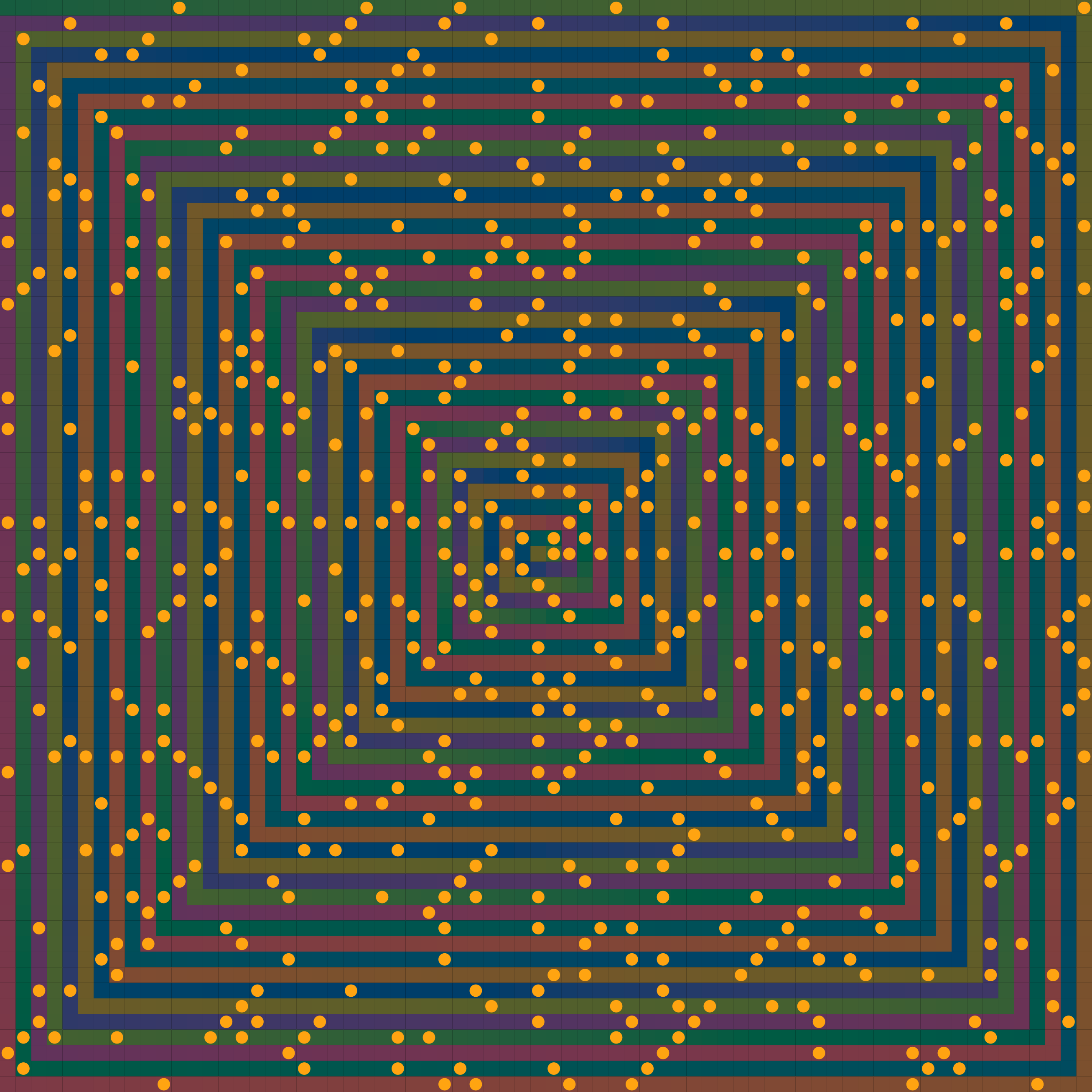 This visualizer divides the rectangular canvas into a grid of r by c identical rectangular cells. Each cell has an integer x coordinate (starting from 1 in the leftmost column and increasing to the right), a y coordinate (starting from 1 in the top row and increasing as you go down), and a "spiral position" s that starts from 1 near the center of the rectangle and increases along a rectangular spiral path that visits every cell in the grid.